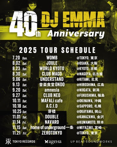 日本が誇る伝説的DJ・DJ EMMAが活動40周年を記念し、北海道から沖縄まで全国13都市14会場を巡る過去最大級のジャパンツアーを開催。