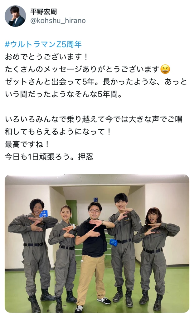 俳優の平野宏周が、自身が出演していた「ウルトラマンZ」の放送5周年を祝ったツイートが話題に。