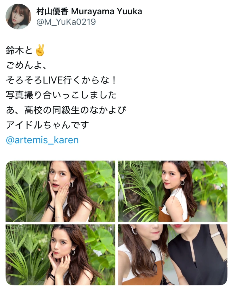 俳優の村山優香が、アイドルグループ「アルテミスの翼」のドルフィン・カレンとのツーショットをアップした。