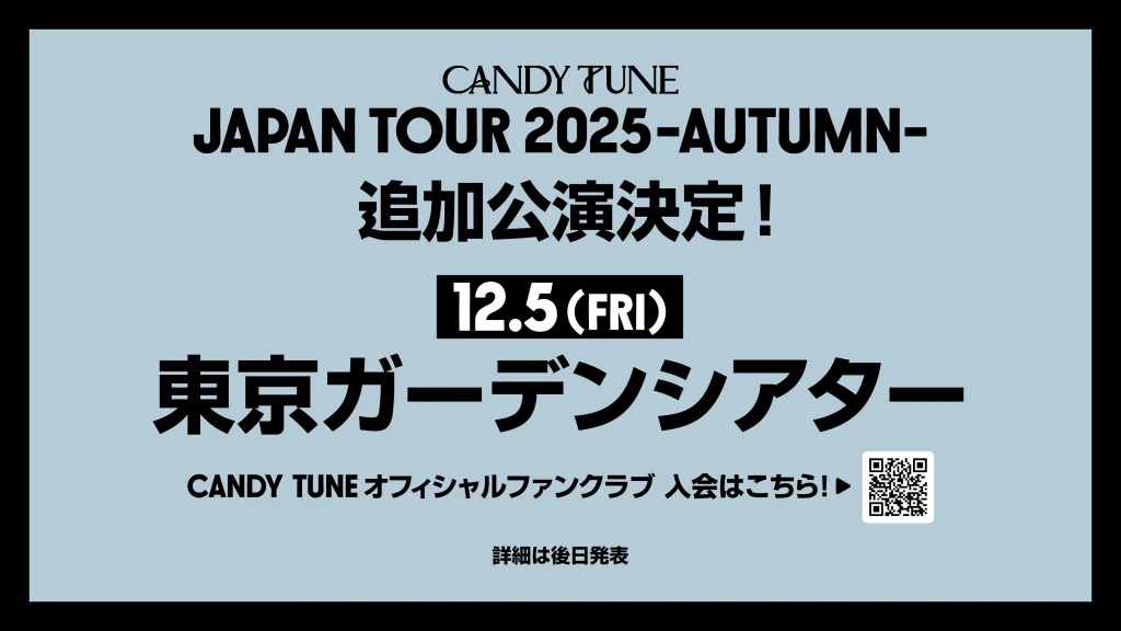 そんな彼女たちが10月からスタートさせる初の全国ツアー『CANDY TUNE JAPAN TOUR 2025 - AUTUMN -』では、神奈川・KT Zepp Yokohamaを皮切りに、大阪・Zepp Namba、愛知・Zepp Nagoya、福岡・Zepp Fukuoka、広島・BLUE LIVE HIROSHIMA、北海道・Zepp Sapporo、宮城・仙台GIGS、東京・Zepp Hanedaの全8都市を巡る。北海道、宮城、神奈川、広島での単独公演はグループ初となる。