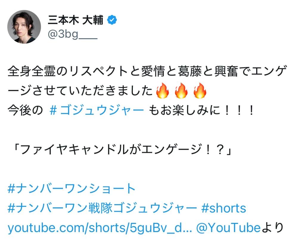 俳優の三本木大輔が、7月6日に放送された「ナンバーワン戦隊ゴジュウジャー」にて、歴代戦隊シリーズの中でもとくに人気の高いシンケンレッドへの変身を遂げた。
