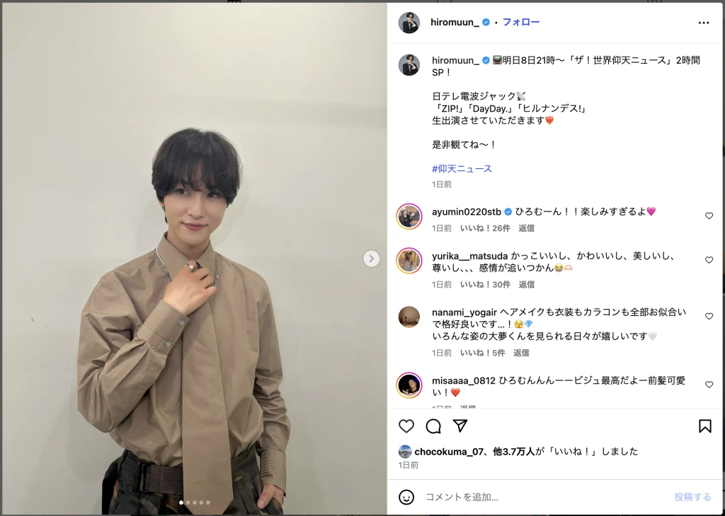「明日8日21時〜「ザ!世界仰天ニュース」2時間SP!日テレ電波ジャック📡「ZIP!」「DayDay.」「ヒルナンデス!」生出演させていただきます❤️🔥」と番組出演を報告し、オフショットを投稿。