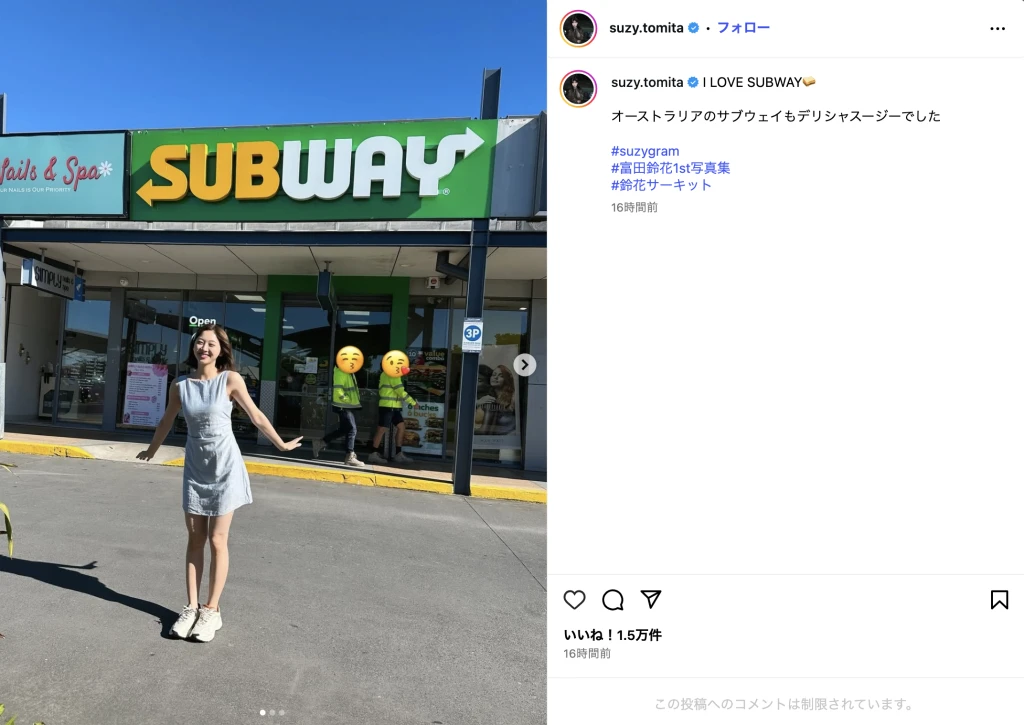 投稿では、SUBWAYの前でポーズを決める姿やSUBWAYの看板の写真などが公開された。