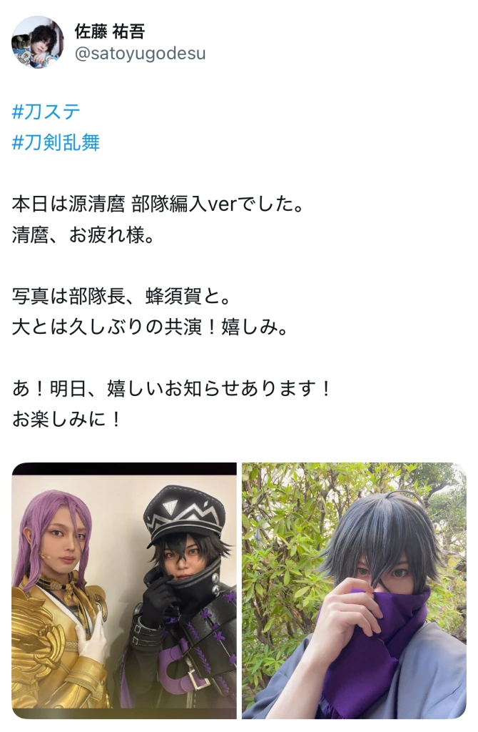 俳優の佐藤祐吾が、現在出演中の舞台『刀剣乱舞』士伝 真贋見極める眼にて共演中の演者とツーショットをアップした。