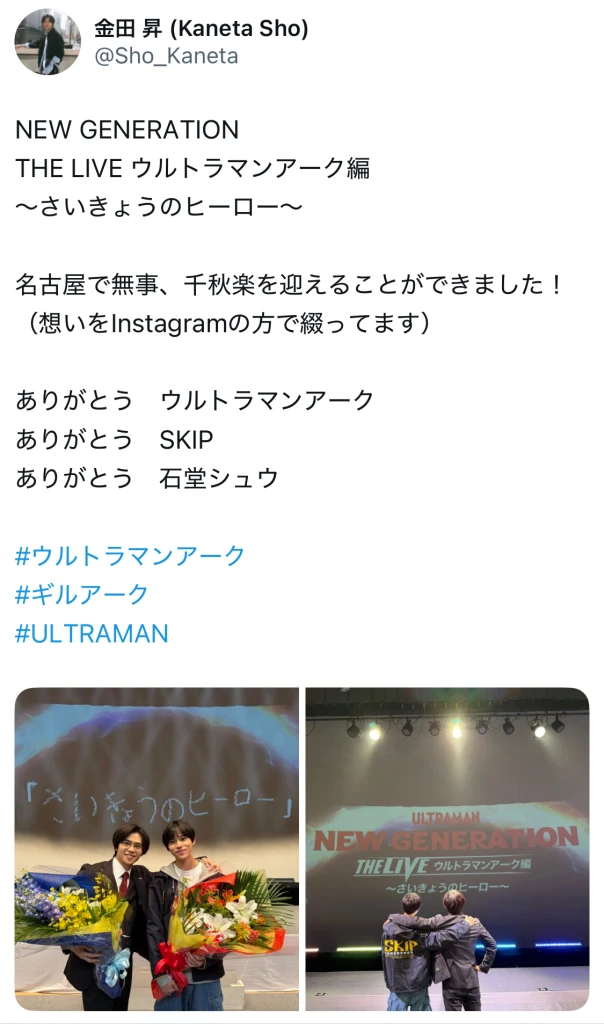 俳優の金田昇が、2月から登壇していた舞台「NEW GENERATION THE LIVE ウルトラマンアーク編 ~さいきょうのヒーロー~」が千穐楽を迎え、感謝を綴った。