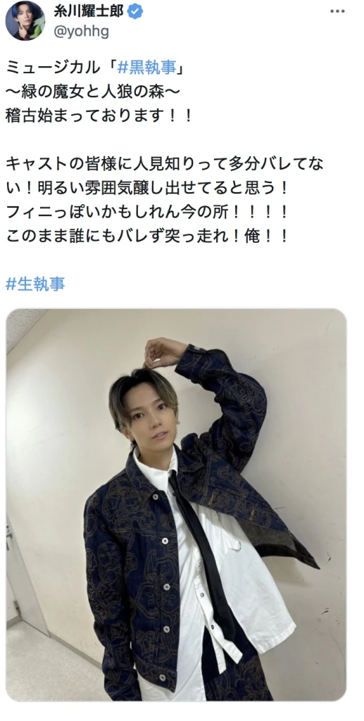 俳優の糸川耀士郎が、ミュージカル「黒執事」~緑の魔女と人狼の森~の稽古場での自身について呟いたポストが話題だ。