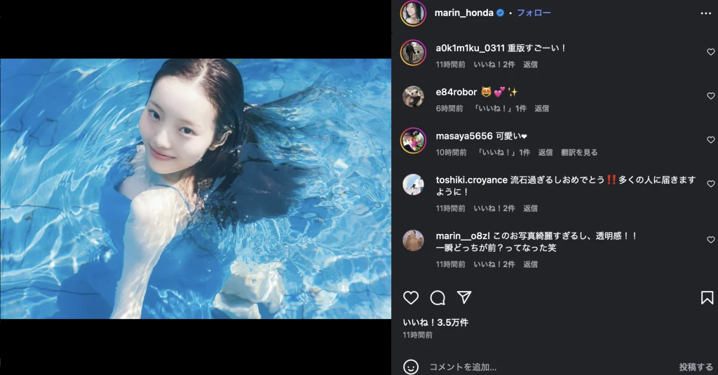 フォロワーからは「透明感凄すぎる!」「流石!おめでとう!」と祝福の声があがった。1st写真集『MARIN』は本田真凜が24歳になる誕生日、8月21日に発売が予定されている。