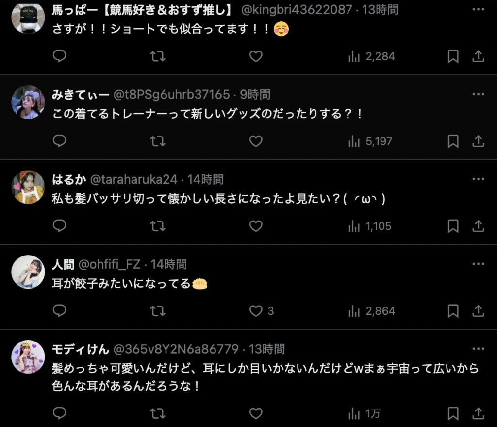 ゴムのようなもので耳を縛っている写真に「耳が餃子みたい」「耳にしか目がいかないんだけどw」とヘアスタイル以外のツッコミが多数寄せられている。ゴムで耳を縛るのは浮腫み対策のセルフケアとして知られており、鎮西寿々歌もその美容法を実践していたようだ。