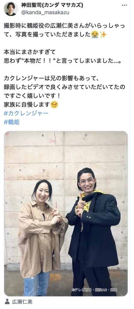 と綴り、カクレンジャーの鶴姫役である広瀬仁美とのツーショットをアップしている。