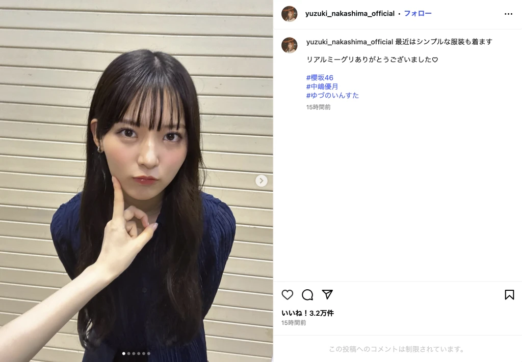 「最近はシンプルな服装も着ますリアルミーグリありがとうございました♡#櫻坂46#中嶋優月#ゆづのいんすた」とファンへの感謝をつづり、写真を投稿。