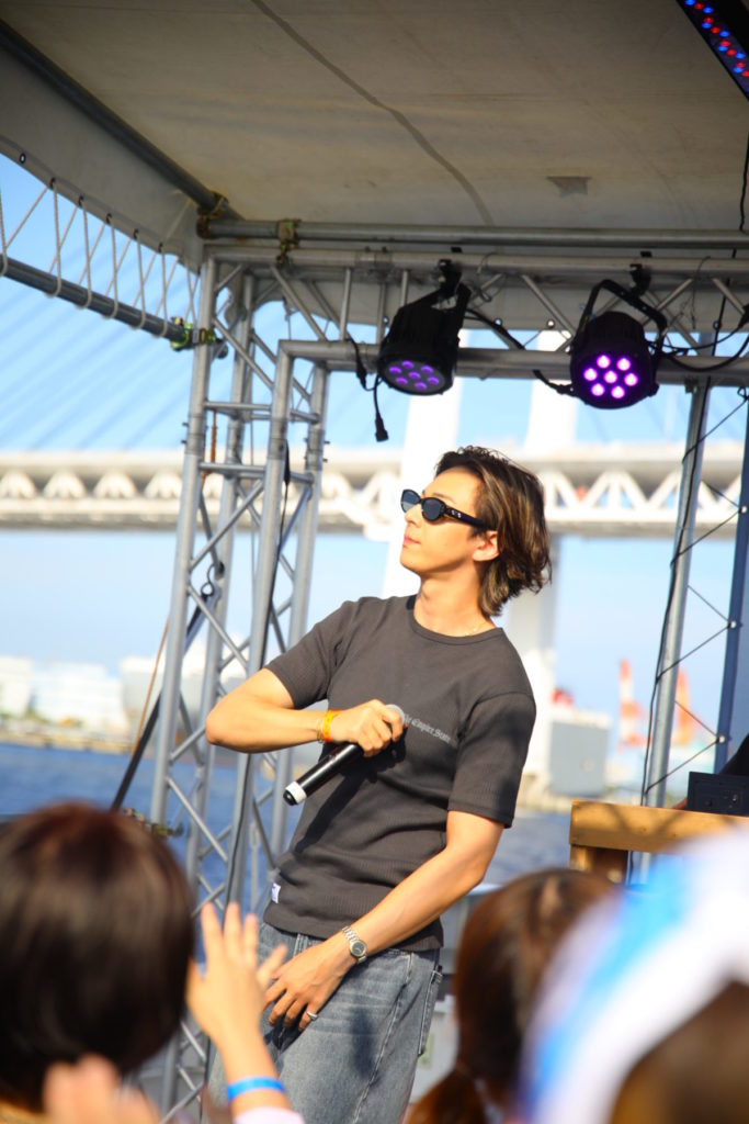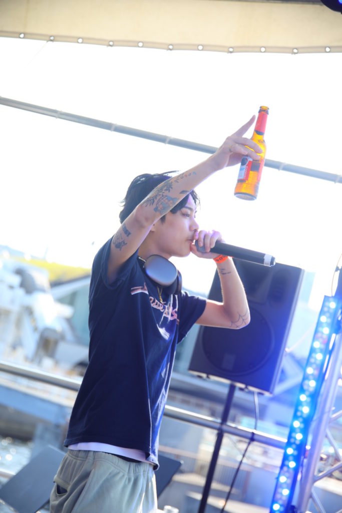 速いビートに合わせて軽快な足取りでステージを左右する。独特のAYフロウ全開の『BLAZE』でフロアをヒートアップ。完璧にビートに乗りこなすと「船の上、気持ちいーー!」と笑顔で潮風を浴びる。