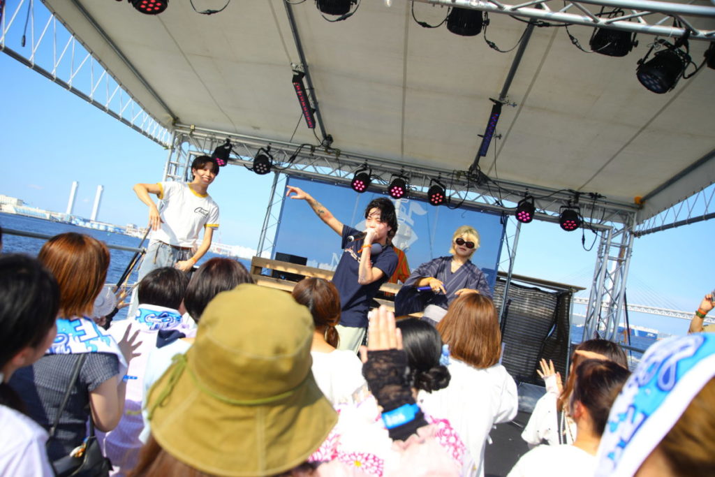 着岸が近づくと出演者全員がステージに上がり、今日一日を笑顔で振り返る。”海の男”MŚTは、待機時間もしっかり潮風に吹かれ黄昏ていたと語り、オーディエンスの愛で船酔いを回避できたと語っていたHINATAは、とうとう愛のストックが切れたのか、人生25年の中で初めての試練に耐えていると顔面蒼白で語った。