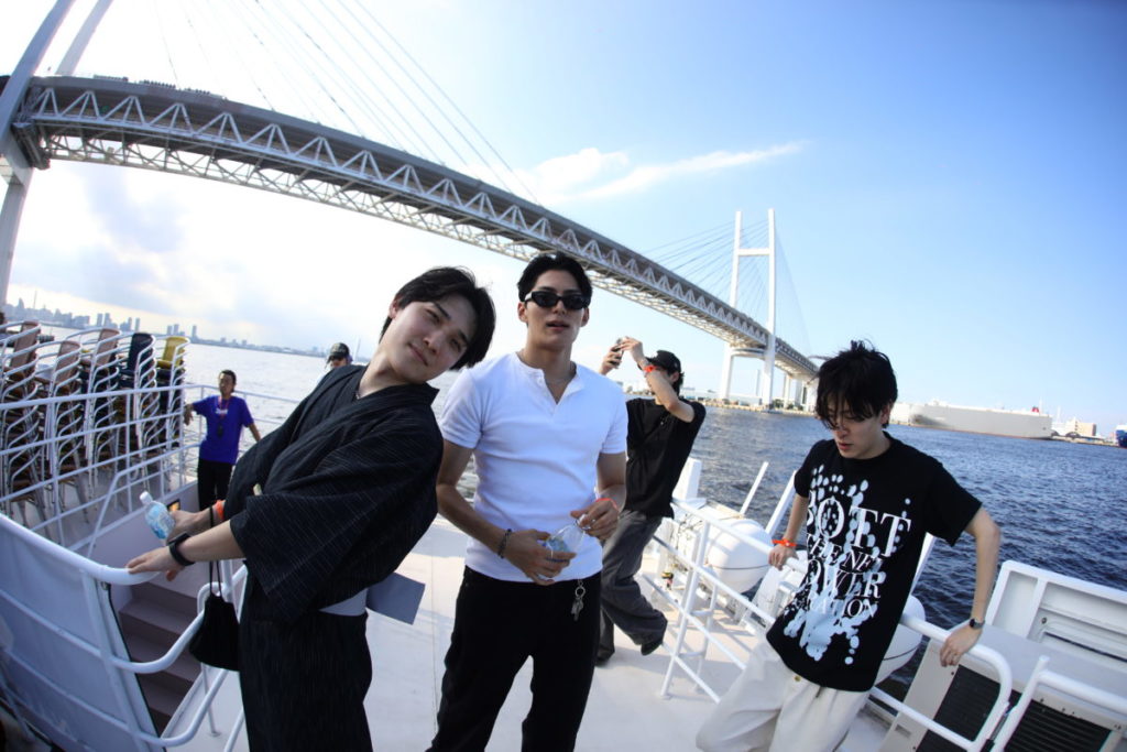 出港した船上で、NIisが指さす先にはわずかに見える横浜港大さん橋ふ頭。REIJI(roomR)や浴衣姿のHADYも、にこにこと笑顔で桟橋に手を振った。