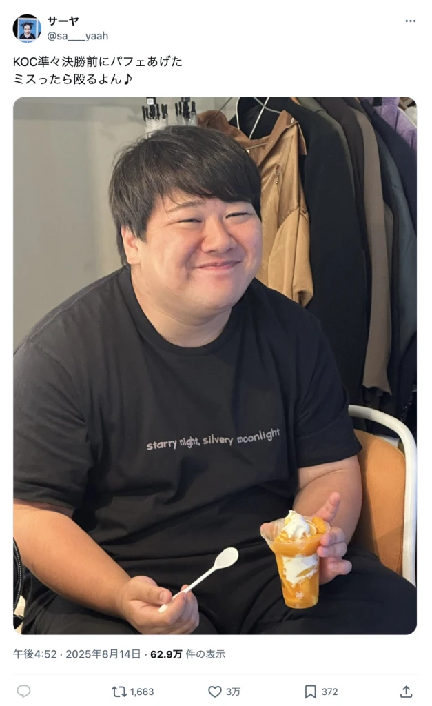 キングオブコント準々決勝前に、相方ニシダへパフェを奢ったことを明かし、そのパフェを手に満面の笑みを浮かべるニシダの姿を公開した。