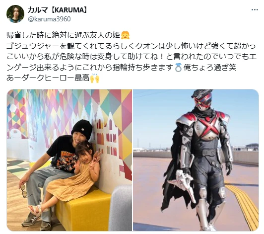 俳優でモデルのカルマが、帰省した際に会った友人の子供に言われた一言で、落ちた様子が話題に。