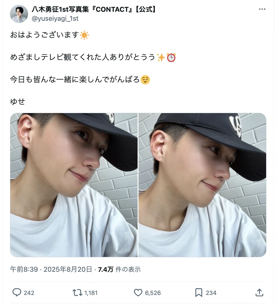 「おはようございます☀めざましテレビ観てくれた人ありがとうう✨⏰今日も皆んな一緒に楽しんでがんばろ😌ゆせ」と呼びかけ、白Tシャツにキャップ姿の自撮り写真を2枚公開した。