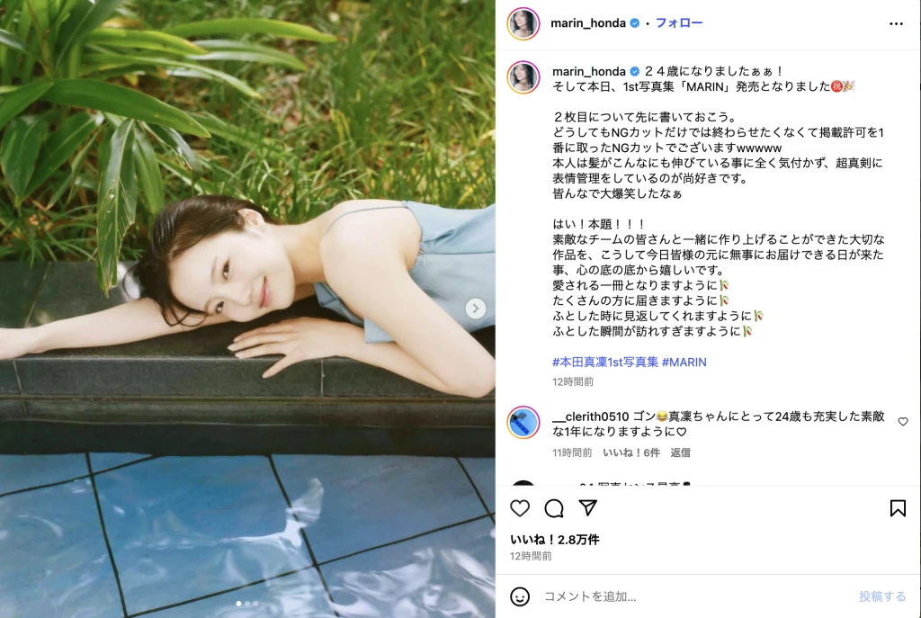 「24歳になりましたぁぁ!そして本日、1st写真集「MARIN」発売となりました㊗️🎉」と誕生日と写真集の同時リリースを報告した。