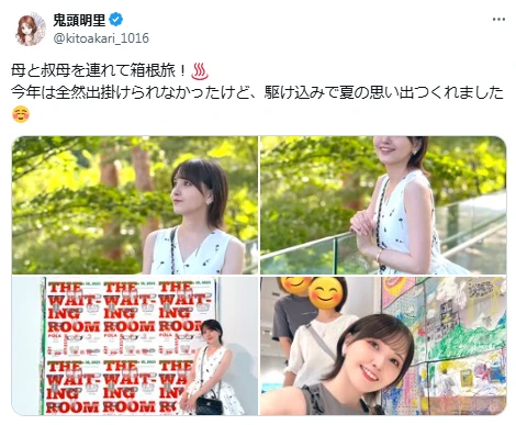 声優の鬼頭明里が、夏の終わりを前に家族と箱根へ旅に行ったと投稿した。
