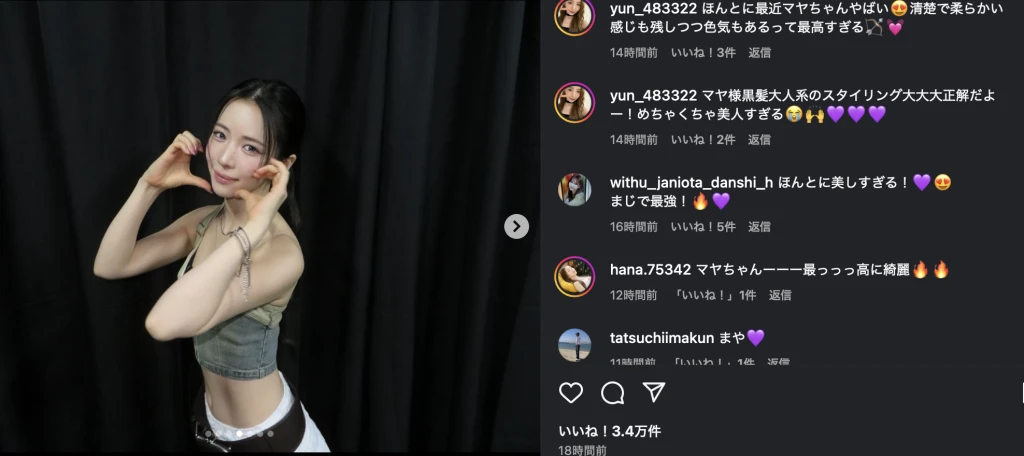 ヘアスタイルだけでなく、魅力的なウエストにも注目が集まっているようだ。ファンからは「ビジュやばすぎ」「細くてキレイ」など、男女問わず多くのファンがマヤの姿に魅了されている。Instagramには7枚の写真が公開されており、1枚1枚の表情にも注目だ。