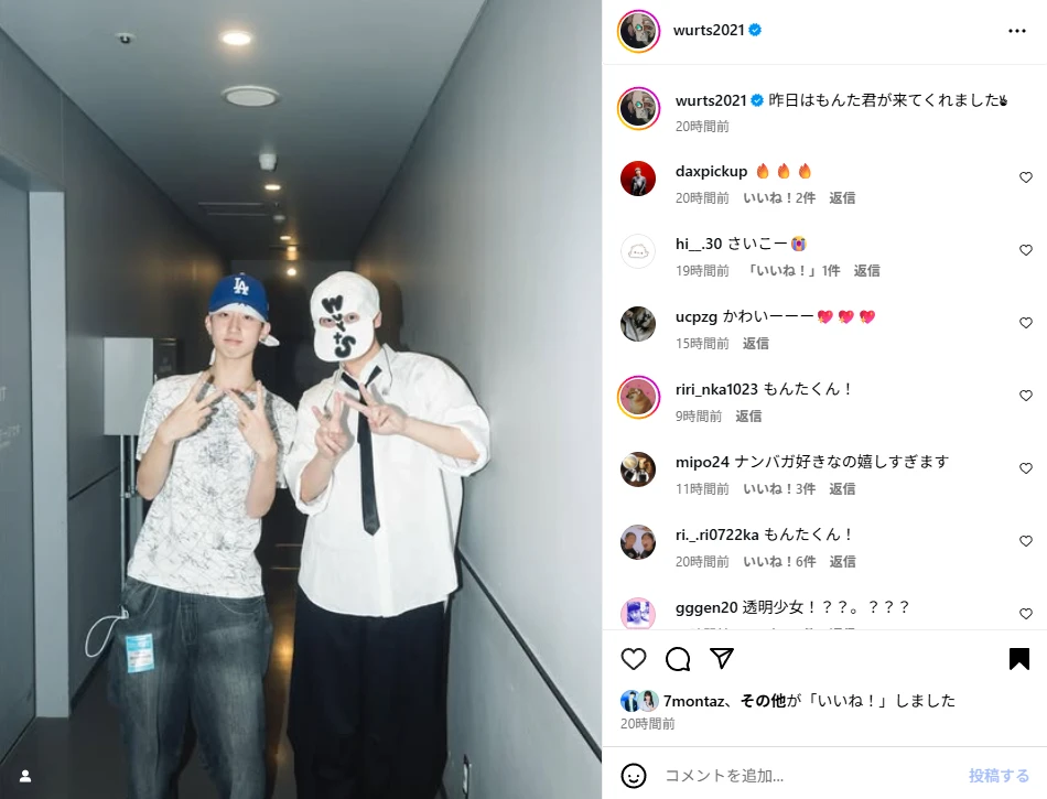 投稿には、『昨日はもんた君が来てくれました✌︎』というキャプションとともに、Wポーズを決めるWurtS(画像右)ともんた(画像左)の2ショットが掲載されている。