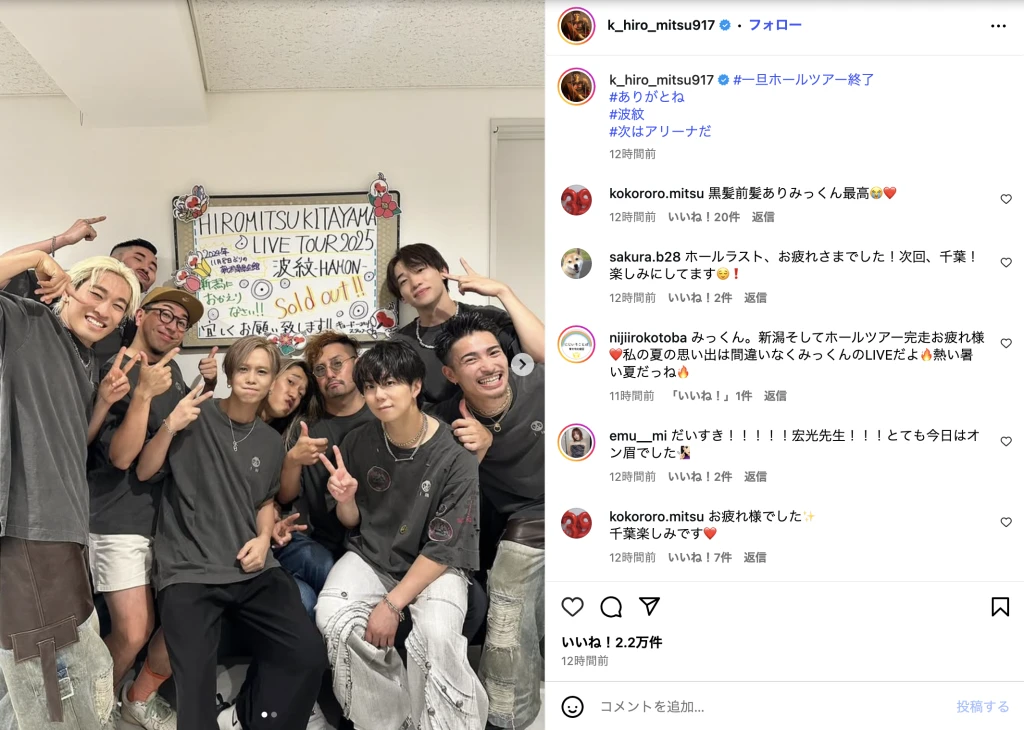 「#一旦ホールツアー終了#ありがとね#波紋#次はアリーナだ」とつづり、HIROMITSU KITAYAMA LIVE TOUR 2025「波紋-HAMON-」のホールツアー最終日を迎えたことを報告。出演者と撮影したオフショットを公開した。