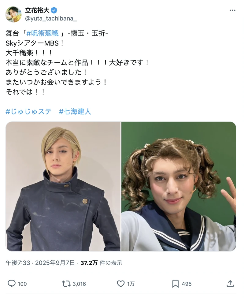 立花裕大『呪術廻戦』舞台が大千穐楽「本当に素敵なチームと作品!」感謝の投稿に反響