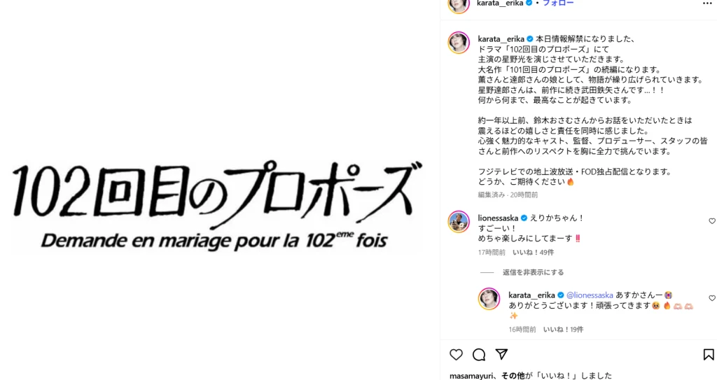 唐田えりかが9月8日にInstagramを更新して、フジテレビ系列のドラマ『102回目のプロポーズ』に出演することを発表した。1991年に大ヒットした『101回目のプロポーズ』の続編となるだけに、多くの人が注目をするドラマになりそうだ。