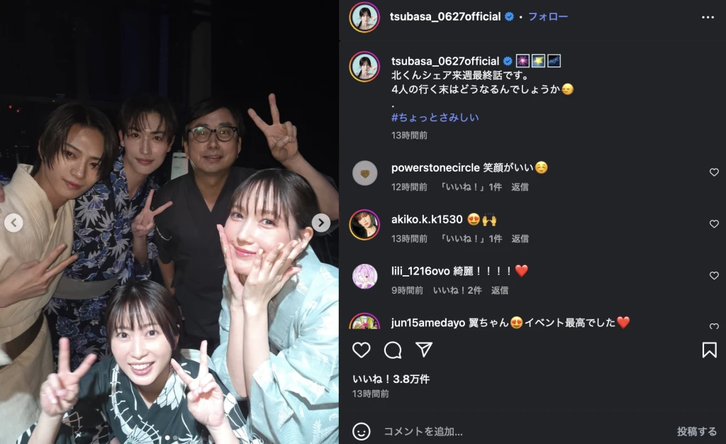 9月10日に本田翼がInstagramを更新。ドラマ「北くんがかわいすぎて手に余るので、3人でシェアすることにしました。」の出演者たちとのオフショットを公開し注目を集めている。