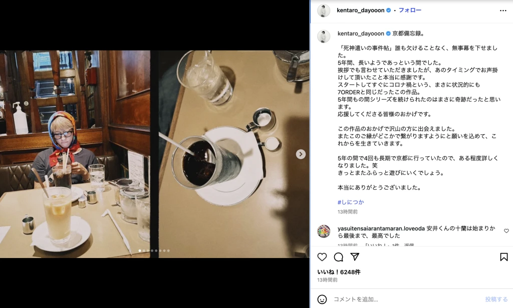 さらに「「死神遣いの事件帖」誰も欠けることなく、無事幕を下せました。5年間、長いようであっという間でした。挨拶でも言わせていただきましたが、あのタイミングでお声掛けして頂いたこと本当に感謝です。スタートしてすぐにコロナ禍という、まさに状況的にも7ORDERと同じだったこの作品。5年間もの間シリーズを続けられたのはまさに奇跡だったと思います。応援してくださる皆様のおかげです。この作品のおかげで沢山の方に出会えました。またこのご縁がどこかで繋がりますようにと願いを込めて、これからを生きていきます。」とと感謝をつづった。