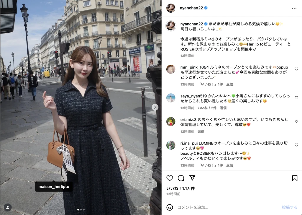 さらに「今週は新宿ルミネ2のオープンがあったり、バタバタしています。新作も沢山なのでお楽しみに😆🫶Her lip toビューティーとROSIERのポップアップショップも開催中✔️」と、ショップオープンやイベント開催についても報告した。
