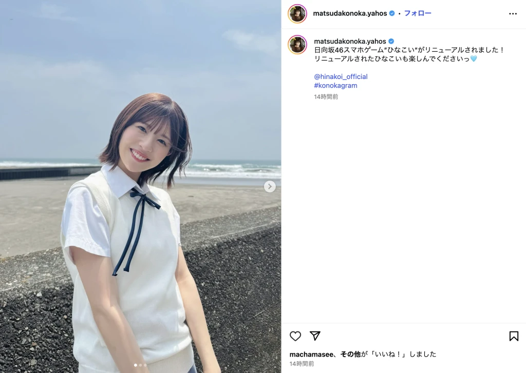 「日向坂46スマホゲーム”ひなこい”がリニューアルされました!リニューアルされたひなこいも楽しんでくださいっ🩵 @hinakoi_official #konokagram」とつづり、スマホゲーム「ひなこい」のリニューアルを宣伝。