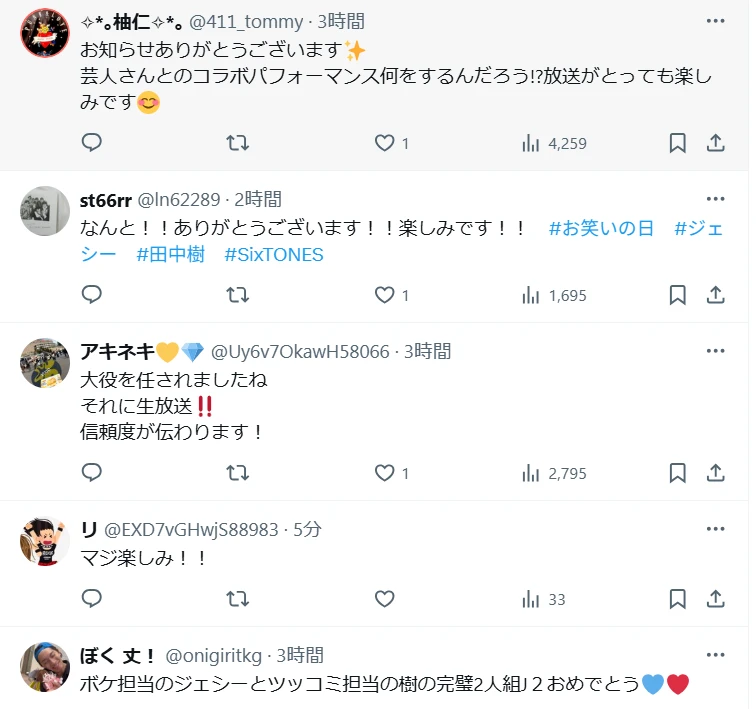 10月11日(土)午後2時から生放送されるTBSの『お笑いの日』第一部スペシャルサポーターに、SixTONESの田中樹とジェシーが起用されることが発表された。