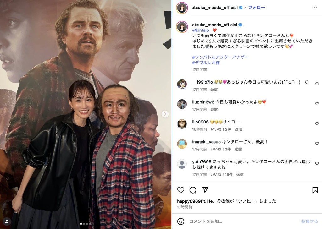 「@kintalo_ ❤️いつも面白くて進化が止まらないキンタローさんと❤️🔥」とつづり、レオナルド・ディカプリオに扮したお笑いタレントのキンタロー。との2ショットを公開。
