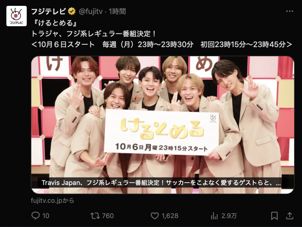 アイドルグループのTravis Japanがフジテレビで初のレギュラー番組MCを務めることを発表した。番組名は『けるとめる』で、サッカーの魅力を世代問わず楽しめる内容となっているようだ。