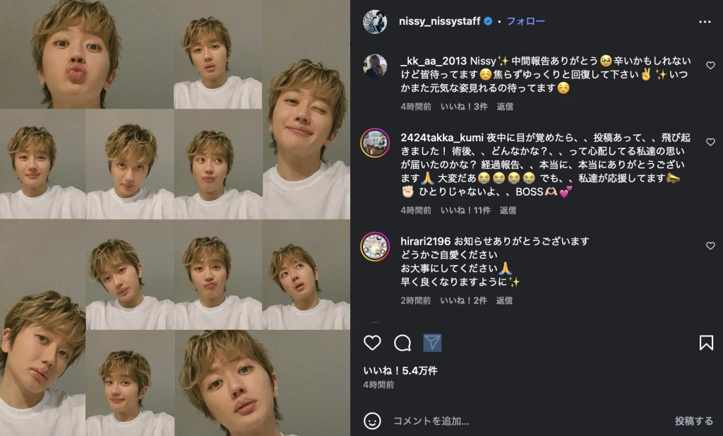これに対してファンは「お顔が見れてよかった」「1日でも良くなりますように…」とメッセージを送っている。Nissyの近影とメッセージに勇気づけられた人が多くいるようだ。