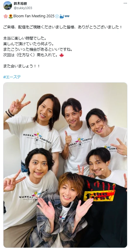 俳優の鈴木裕樹が、MANKAI STAGE『A3!』Bloom Fan Meeting 2025に出演し、オフショットを投稿し話題に。