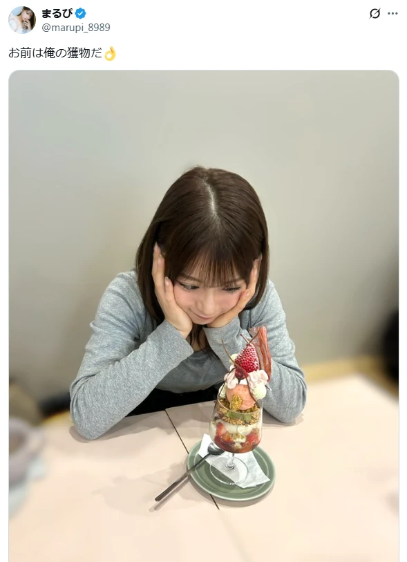 タレントで俳優のまるぴが、パフェ前での写真を投稿し話題に。