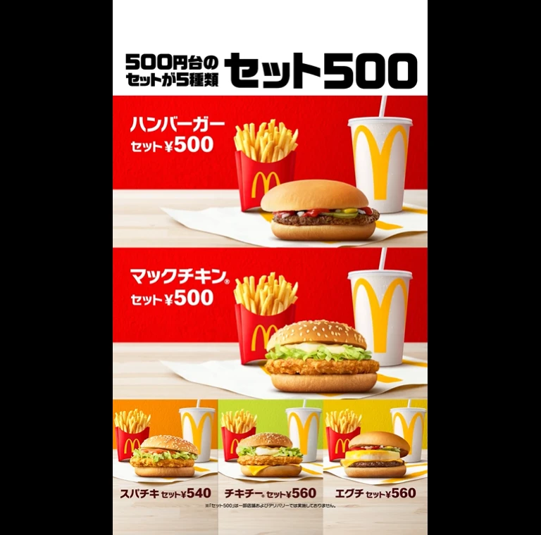平日も土日も、昼も夜もいつでもおトクな、5種類の500円台セットが楽しめるメニューだ。