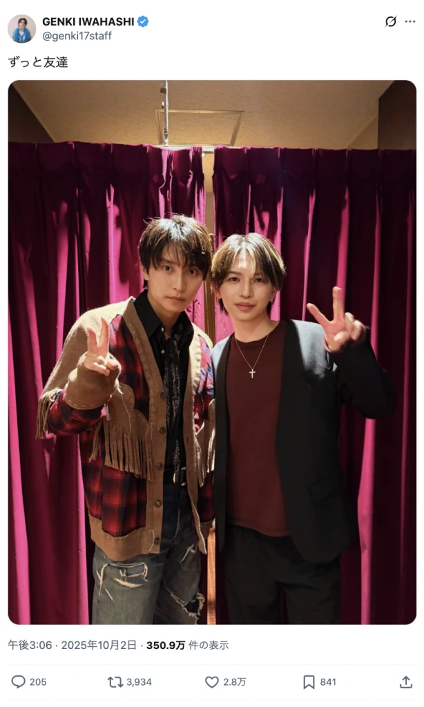 岩橋玄樹、阿部顕嵐との2ショット公開「ずっと友達」にファン歓喜