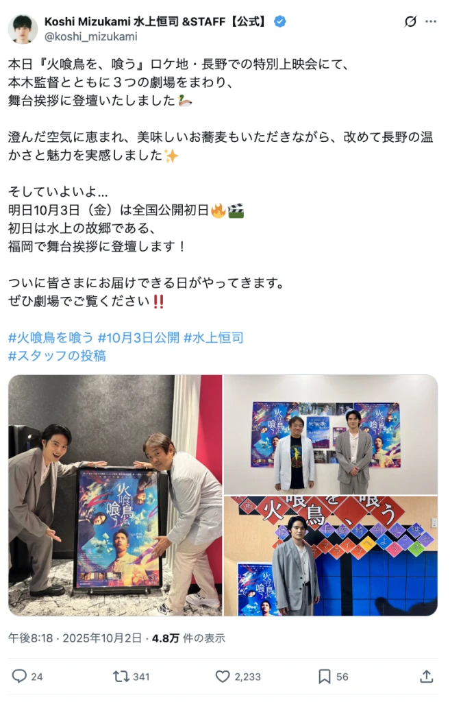 「そしていよいよ...明日10月3日(金)は全国公開初日🔥🎬初日は水上の故郷である、福岡で舞台挨拶に登壇します!ついに皆さまにお届けできる日がやってきます。ぜひ劇場でご覧ください‼️」と全国公開に向けて呼びかけた。