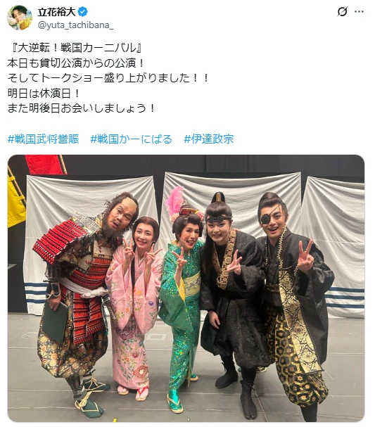 俳優の立花裕大が、自身が出演する舞台「大逆転!戦国カーニバル」でのオフショットを公開した。