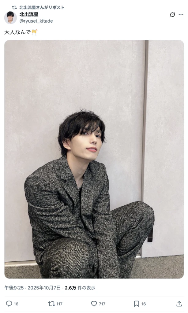 北出流星、「大人なんで」スーツ姿にファン「大人な流星くん最高!」