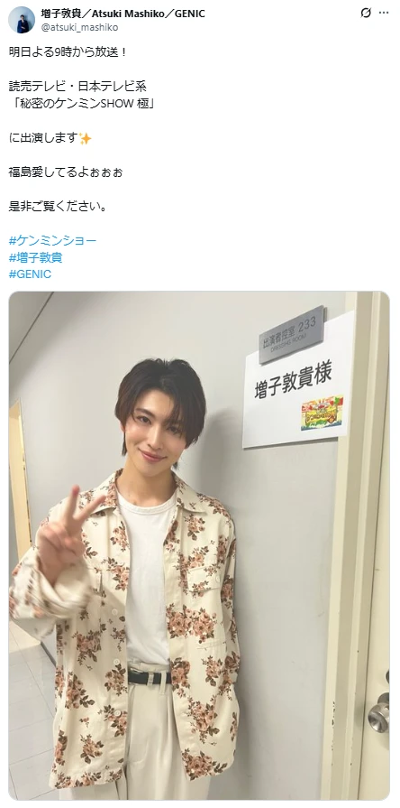 俳優の増子敦貴が、ケンミンショーへの出演を報告し、地元への愛を叫んだ。