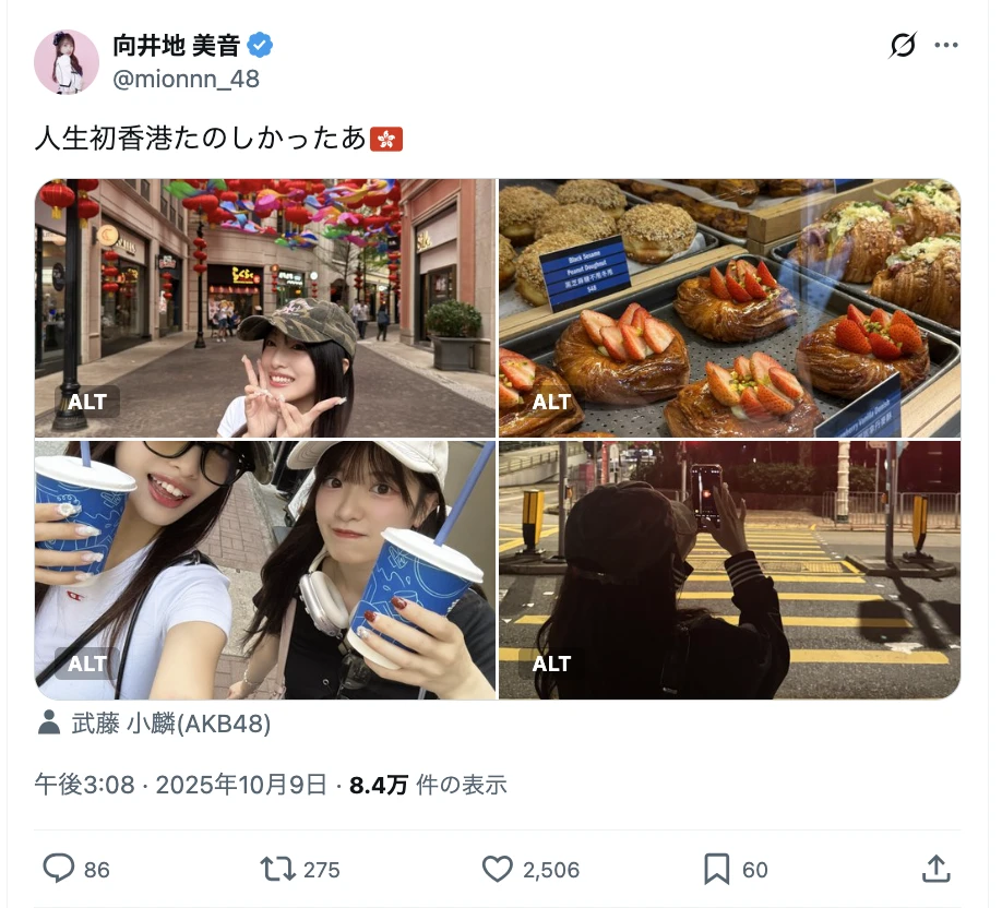 「人生初香港たのしかったあ🇭🇰」とつづり、「AKB48 20th Year Live Tour 2025 〜PARTYが始まるよ〜」のツアーで訪れた香港でのオフショットを投稿。