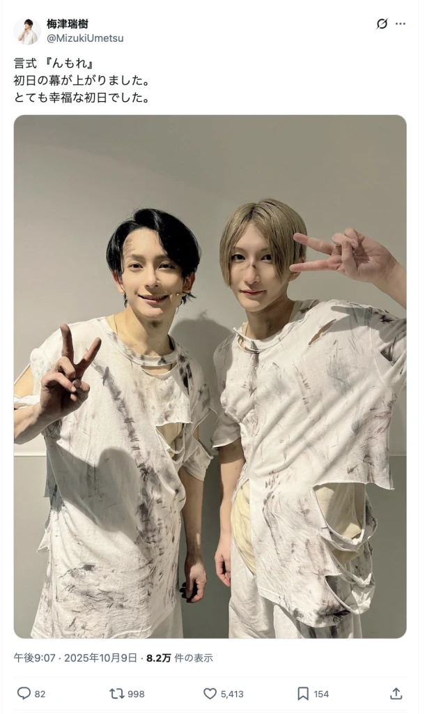 俳優・梅津瑞樹、「言式『んもれ』」初日を報告 「とても幸福な初日でした」と橋本祥平との2ショット公開