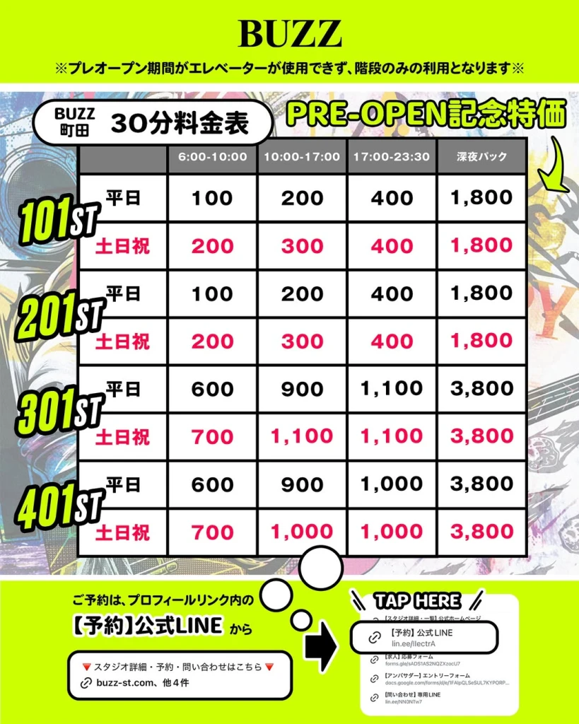 BUZZ町田店は、町田エリアでは最大級規模となる、全8スタジオ・5フロア構成のレンタルスタジオ。