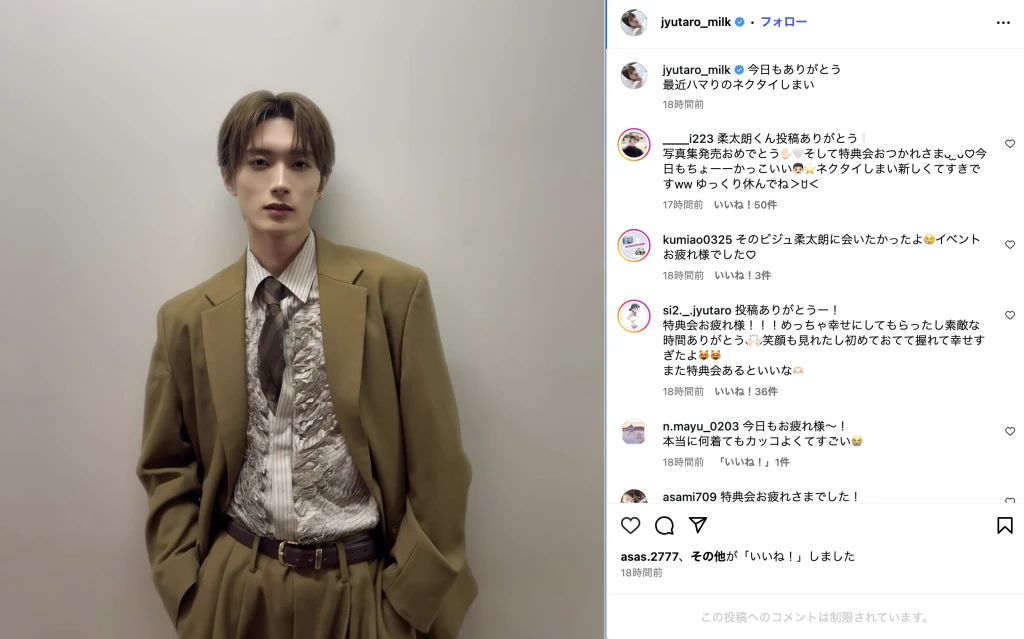 ファンからは「ネクタイしまい新しくてすきですww 」「めっちゃ幸せにしてもらったし素敵な時間ありがとう⸜🙌🏻⸝笑顔も見れたし初めておてて握れて幸せすぎたよ😻😻」などの声が寄せられている。