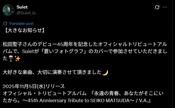 松田聖子のデビュー45周年を記念したトリビュートアルバム『永遠の青春、あなたがそこにいたから。~45th Anniversary Tribute to SEIKO MATSUDA~』が、11月5日よりAmazon Musicにて独占先行配信されることが決定した。また、同日よりAmazon.co.jpでは限定盤CDの先行発売も行われる。