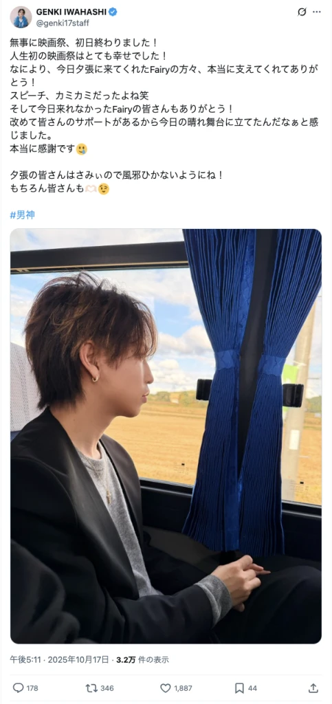 「無事に映画祭、初日終わりました!」と報告。「人生初の映画祭はとても幸せでした!なにより、今日夕張に来てくれたFairyの方々、本当に支えてくれてありがとう!スピーチ、カミカミだったよね笑そして今日来れなかったFairyの皆さんもありがとう!改めて皆さんのサポートがあるから今日の晴れ舞台に立てたんだなぁと感じました。本当に感謝です🥲夕張の皆さんはさみぃので風邪ひかないようにね!もちろん皆さんも🫶🏻😉#男神」とファンへ呼びかけた。