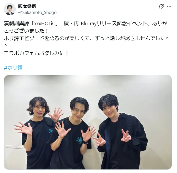 俳優の阪本奨悟が、演劇調異譚「xxxHOLiC」 -續・再-のBlu-rayリリース記念イベントに参加し、オフショットを投稿した。